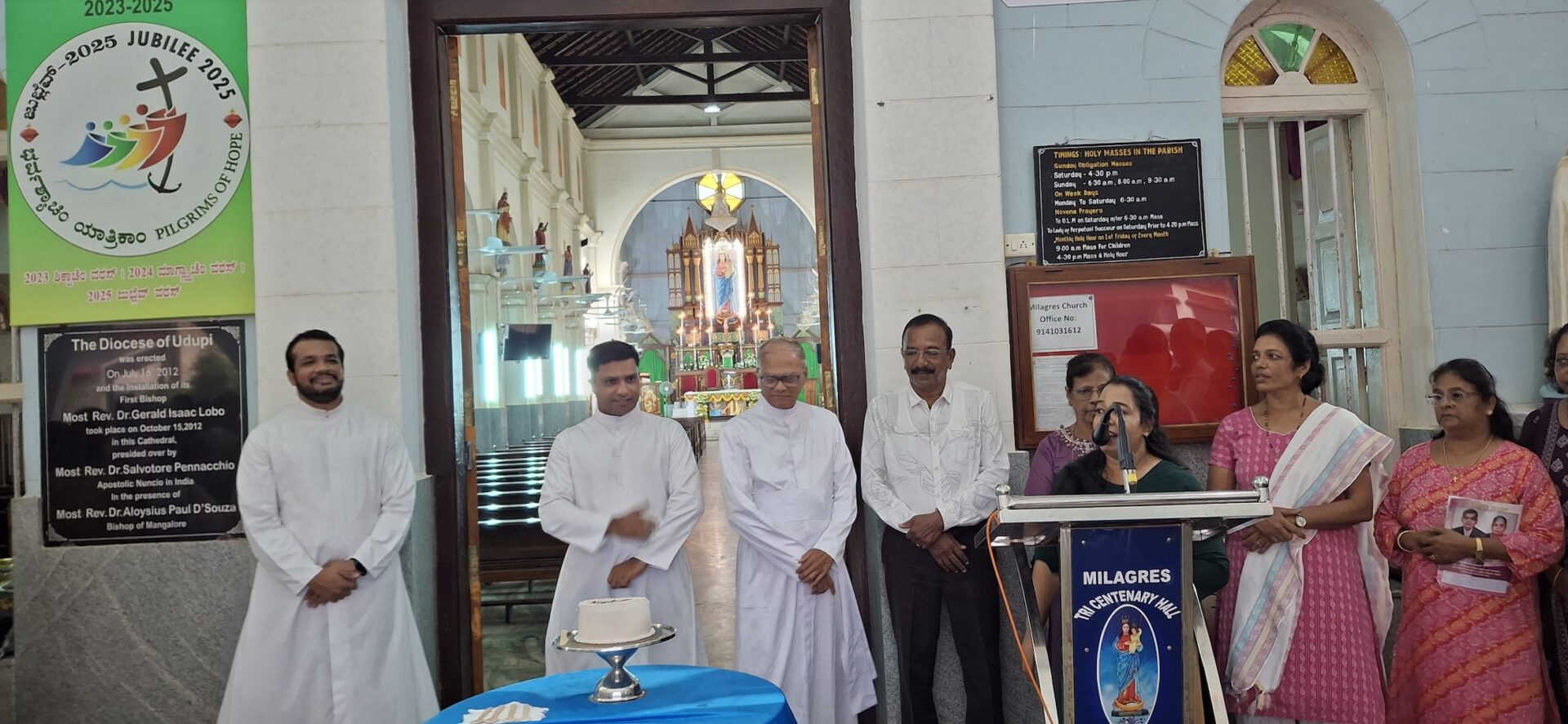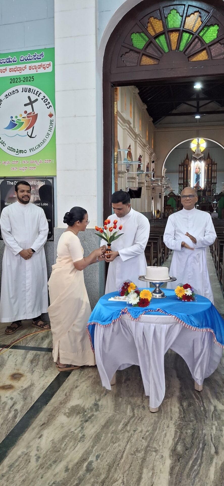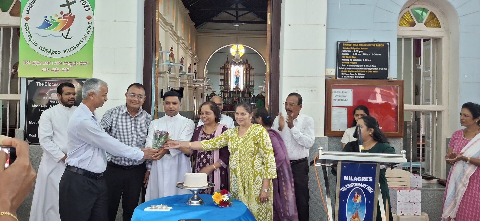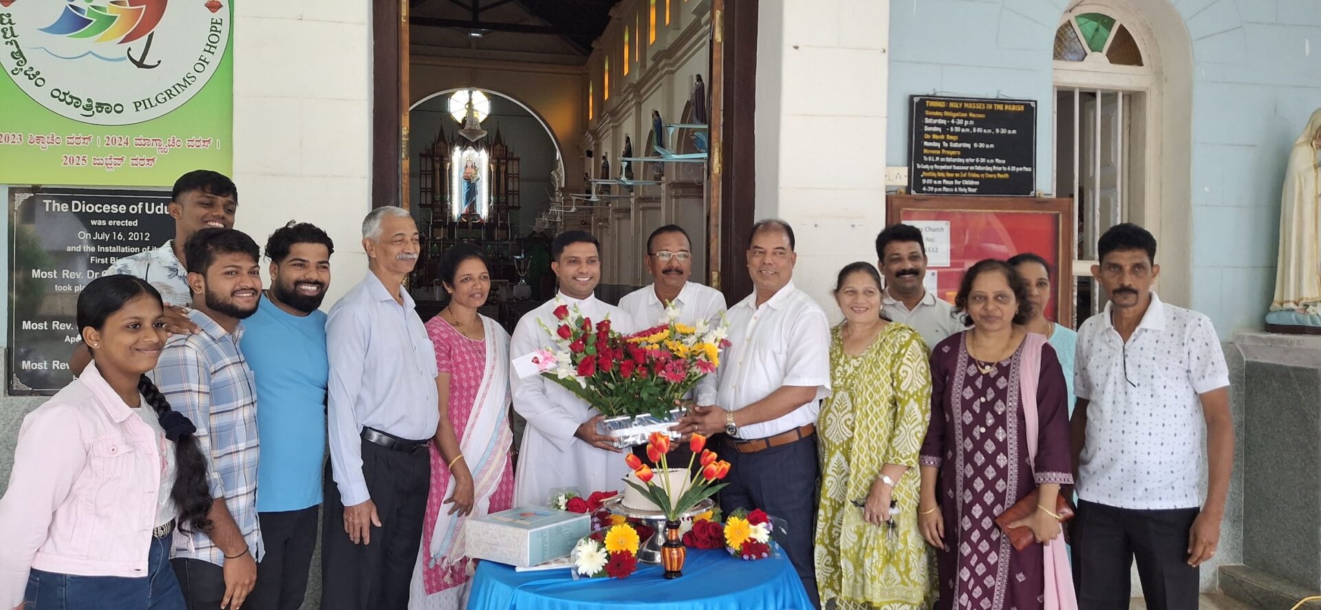 The parishioners of Milagres Cathedral, Kallianpur, joyfully celebrated the birthday of Rev. Fr. Pradeep Cardoza, Assistant Parish Priest, on 18th September 2025. The celebration began with the Holy Eucharist at 6:45 a.m. at Milagres Cathedral. The Mass was concelebrated by Fr. Pradeep Cardoza, Msgr. Ferdinand Gonsalves, Parish Priest and Vicar General of the Diocese of Udupi, and Fr. Parel Fernandes, Spiritual Director of the Pilar Fathers. The liturgy was further enriched by the melodious voices of the choir, which added devotion and beauty to the celebration.